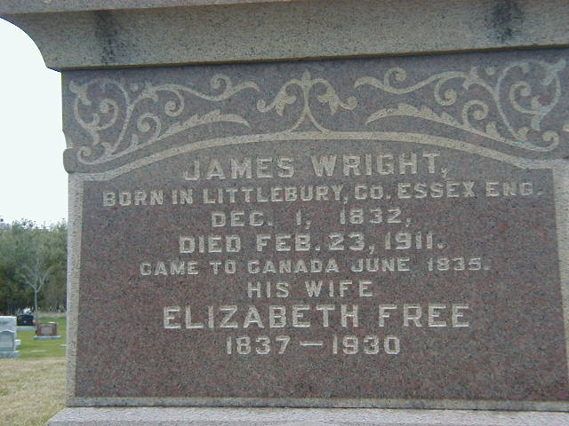 Cemetery Transcription: Name: James Wright; Born: Dec 1 1832; Died: Feb 23 1911; Spouse: Elizabeth Free; Notes: Born in Littlebury Co., Essex, England, came to Canada June 1835 (McPhail's Cemetery Transcription by Judy & Bill Mills, 2001, 2002, pg. 18 - Row 8, stone 12.)6,8