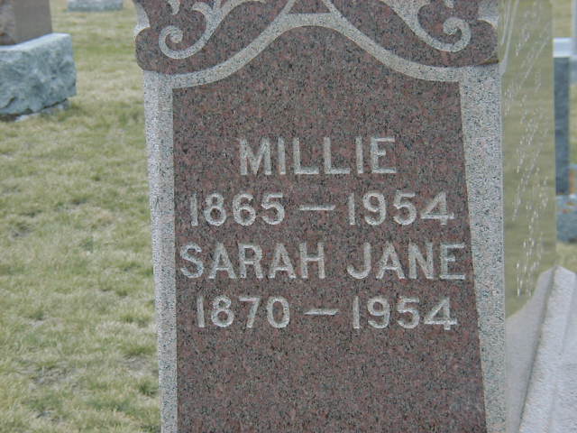 Sarah Jane Wright was born on 9 April 1870 at Brighton Twp., Northumberland Co., Ontario; Date 1870 per Memorial. Date apr 9 1870 & location Ont. rural per 1901 Census. Date 1870 & location Ont. per 1891 Census. Date 1870 & location Ont. per 1881 Census. Date 1870 & location Ont. per 1871 Census. Date 1870 per Cemetery Transcription.1,2,4,5,6,3 She appeared on the census of April 1871 at Brighton Twp., Northumberland Co., Ontario; Age 1 at 1871 Census: see James Wright.2 She appeared on the census of April 1881 at Brighton Twp., Northumberland Co., Ontario; Age 11 at 1881 Census: see James Wright.4 She appeared on the census of 15 April 1891 at Brighton Twp., Northumberland East Co., Ontario; Age 21 at 1891 Census: see James Wright.3 She appeared on the census of April 1901 at Brighton Twp., Northumberland Co., Ontario; Age 30 at 1901 Census: see James Wright.1 She was buried in 1954 at McPhail's Cemetery, Brighton Twp., Northumberland Co., Ontario; Memorial: (See Exhibit) Millie; 1865 - 1954; Sarah Jane; 1870 - 1954 (McPhail's Cemetery, Brighton Twp., Apr 28, 2007)