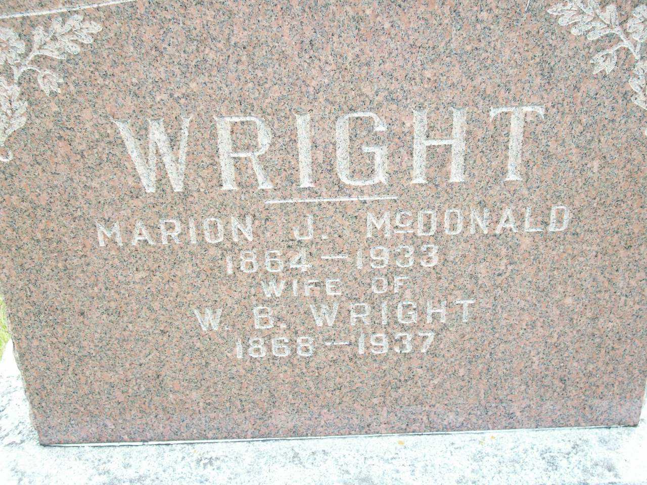 Marion Josephine McDonald was born on 13 June 1864 at Cramahe Twp., Northumberland Co., Canada West; Date 1864 per Memorial. Date Jun 13 1864 & location Ont. per CemSearch. Date Jun 13 1864 & location Ont. rural per 1901 Census. Date 1865 & location Ont. per 1871 & 1881 Census. per Birth Reg'n. of daughter Myrtle Helena Wright.1,5,6,7,3,4 She appeared on the census of April 1871 at Cramahe Twp., Northumberland Co., Ontario; Age 6 at 1871 Census: see George N. McDonald.6 She appeared on the census of April 1881 at Cramahe Twp., Northumberland Co., Ontario; Age 16 at 1881 Census: see George N. McDonald.7 She lived on 29 November 1882 at Cramahe Twp., Northumberland Co., Ontario; Witness at marriage of Florence Evelyn (McDonald) Wright.2 She married William Burton Wright, son of John Robert Wright and Elizabeth Barker, on 13 June 1893 at Colborne, Northumberland Co., Ontario; Date Jun 13 1893 & location Colborn per CemSearch. per 1901 Census. per Birth Reg'n. of daughter Myrtle Helena Wright.1,5,3 As of 13 June 1893,her married name was Wright.1 Marion Josephine McDonald appeared on the census of April 1901 at Cramahe Twp., Northumberland Co., Ontario; Age 36 at 1901 Census: see William Wright.5 She died on 26 June 1933 at Colborne, Northumberland Co., Ontario, at age 69; Date 1933 per Memorial. Date Jun 26 1933 & location Colborne per CemSearch.3,4 She was buried on 28 June 1933 at Salem Cemetery, Cramahe Twp., Salem, Northumberland Co., Ontario; Memorial: (see Exhibit) WRIGHT; Marion J. McDonald; 1864 - 1933; Wife of; W. B. Wright; 1868 - 1937 (Salem Cemetery, Cramahe Twp., July 6 2009, by Dan)