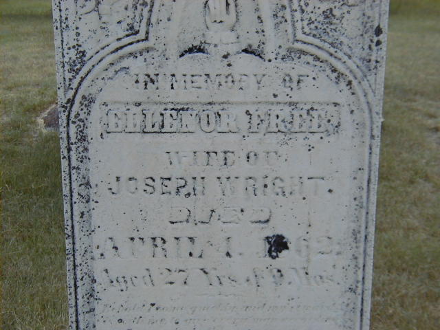 Ellenor Free was born in July 1834 at Ontario; Date Jul 1834 per Memorial. Date 1836 & location UC per 1861 Census.1,2 As of before 1854,her married name was Wright.1 She married Joseph Wright, son of David Wright and Sarah Mumford, before 1854 at Northumberland Co., Canada West; per 1861 Census.1 Ellenor Free appeared on the census of April 1861 at Brighton Twp., Northumberland Co., Ontario; Age 25 at 1861 Census: see Joseph Wright.1 She died on 4 April 1862 at Brighton Twp., Northumberland Co., Ontario, at age 27; Date Apr 4 1862 per Memorial. Wife of Joseph Wright is Margaret White per marriage register 1865.3,2 She was buried on 6 April 1862 at McPhail's Cemetery, Brighton Twp., Northumberland Co., Ontario; Memorial: (See Exhibit) In Memory of; Ellenor Free; Wife of; Joseph Wright; Died; April 4, 1862; Aged 27 Yrs. & 9 Mos. (McPhail's Cemetery, Brighton Twp., Jun 4 2006.)2
