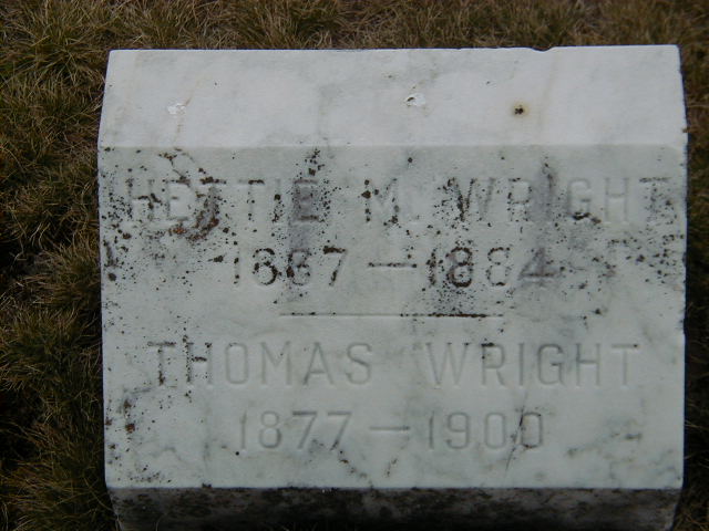 Thomas Wright was born in 1878 at Brighton Twp., Northumberland Co., Ontario; Date 1877 per Memorial. Date 1878 & location Ont. per 1891 Census. Date 1878 & location Ont. per 1881 Census.1,2,3 He appeared on the census of April 1881 at Brighton Twp., Northumberland Co., Ontario; Age 3 at 1881 Census: see James Wright.1 He appeared on the census of 15 April 1891 at Brighton Twp., Northumberland East Co., Ontario; Age 13 at 1891 Census: see James Wright.3 He was buried in 1900 at McPhail's Cemetery, Brighton, Northumberland Co., Ontario; Memorial: (See Exhiibit) Hettie M. Wright; 1867 - 1884; Thomas Wright; 1877 - 1900 (McPhail's Cemetery, Brighton Twp., Apr 28, 2007)
