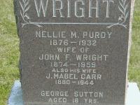 CemSearch: Name: John F. Wright; Born: 1874; Died: 1959; Age: 78; ID: SHILOH042; Other names: Sutton, George (1892-1909), Wright, J. Mabel [Carr](1880-1944), Wright, Nellie M. [Purdy](1876-1932); Cemetery: Shiloh Cemetery, Conc 6, Lot 15, Cramahe Twp., Row 11 Plot 12; Note: Son of John Wright and Elizabeth Barker; married March 23 1899 in Edville to (1) Nellie M. Purdy 23, born Cramahe Twp. & (2) J. Mabel Carr. Additional information from Northumberland and Durham Marriage Registers. (https://www.cemsearch.ca/burial/?pID=SHILOH042%5E1.)6,7