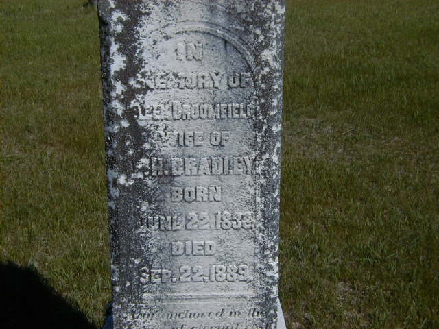Ellen Broomfield was born on 22 June 1838 at Haldimand Twp., Northumberland Co., Ontario; Date June 22 1838 per Memorial. Date 1838 & location Cda. per 1851 Census. Date Jun 22 1838 & location Haldimand per IGI Record. Date 1839 & location Haldimand per Death Reg'n.1,2,3,4 She appeared on the census of 1851 at Haldimand Twp., Northumberland Co., Ontario; Age 13 at 1851 Census: see John Broomfield.1 As of 8 March 1858,her married name was Bradley.2 She married Francis Henry Bradley, son of Sylvanus Bradley and Sarah "Sally" Tucker, on 8 March 1858 at Haldimand Twp., Northumberland Co., Ontario; "Henry BRADLEY, 21, Haldimand, same, s/o Silvanus & Sally, married Ellen BROWNFIELD, 20, Haldimand, same, d/o John & Isabella, witn: Ethelbert BREWSTER & A--? NOBLE, both of Haldimand, 8 March 1858" from http://homepages.rootsweb.com/~maryc/cobourg.htm - Ontario Marriages Website.