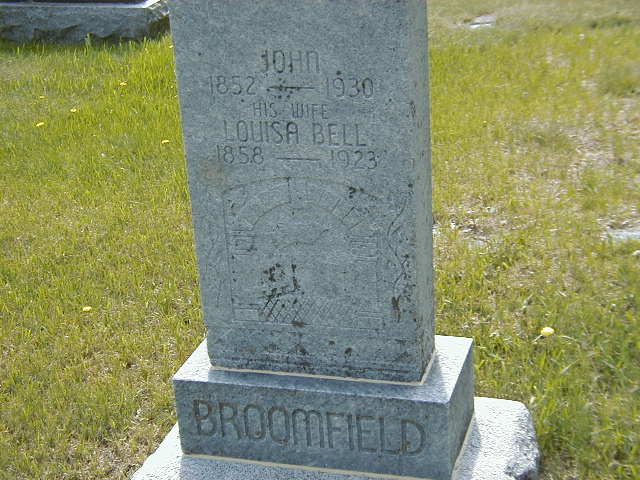 Louisa Eddy was born in November 1858 at Haldimand Twp., Northumberland Co., Ontario; Date 1859 & location Ont. per 1871 Census. Date 1858 & location UC per 1861 Census. Date 1858 & location Haldimand Twp. per marriage reg'n. Date Nov 1858 & location Haldimand per Death Reg'n.1,3,4,5 She appeared on the census of April 1861 at Haldimand Twp., Northumberland Co., Ontario; Age 3 at 1861 Census: see Eli Eddy.4 She appeared on the census of April 1871 at Haldimand Twp., Northumberland Co., Ontario; Age 12 at 1871 Census: see Eli Eddy.5 As of circa 1880,her married name was Bell.2 She married John Bell circa 1880 at Ontario; per Memorial of Louise (Bell, Eddy) Broomfield.2 Louisa Eddy lived on 26 February 1906 at Conc A Lot 18, Haldimand Twp., Northumberland Co., Ontario; Informant for Death Reg'n. of her husband John Bell.3 As of 12 December 1906,her married name was Broomfield.1 She married John Smith Broomfield, son of John Broomfield and Isabella Laing, on 12 December 1906 at Cramahe Twp., Colborne, Northumberland Co., Ontario; Marriage Reg'n.#014600: Groom: John Smith Broomfield; Age: 54; Res. & Born: Haldimand; Status: bachelor; Occ.: farmer; Parents: John Broomfield & Isabella Laing; Bride: Louise Bell; Age: 48; Res. & Born: Haldimand; Status: widow; Parents: Eli Eddy & Helen McMurray; Wit.: L. H. & Alice M. Duncan, Colborne; Date: Dec 12 1906; Place: Colborne; Rel.: Pres; Performed by: Peter Duncan, Colborne; Reg'd.: Dec 18 1906 (Ontario Marriage Registration, #014600-1906, ancestry.com.)6 Louisa Eddy died on 26 December 1923 at Haldimand Twp., Northumberland Co., Ontario, at age 65; Death Reg'n.#024141: Name: Louise Broomfield; Date: Dec 26 1923; Age: 65 yrs., 1 mos; Born: Haldimand, Nov 13 1858; Status: married; Nat.: Irish; Parents: Eily Eddy, b. Haldimand & Helen McMurray, b. Ireland; Cause: heart failure; Phys.: Dr. H. C. Hutcheson, Grafton; Inf.: John Broomfield, Vernonville, husband; Burial: Vernonville, Dec 28 1923; Inf.: James Blacklock & son, Grafton; Reg'd.: Dec 28 1923 (Ontario Death Registration, #024141-1923, ancestry.com.)7 She was buried on 28 December 1923 at Vernonville Cemetery, Haldimand Twp., Vernonville, Northumberland Co., Ontario; Memorial: (See Exhibit) John; 1852 - 1930; His Wife; Louisa Bell; 1858 - 1923 (Vernonville Cemetery, Haldimand Twp., May 23 2005) Per Death Reg'n.3,2