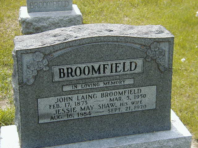 John Laing Broomfield was born on 17 February 1873 at Haldimand Twp., Northumberland Co., Ontario; Date Feb 17 1873 & location Ont. rural per 1901 Census.1 He appeared on the census of April 1901 at Haldimand Twp., Northumberland Co., Ontario; Age 28 at 1901 Census: see Robert L. Broomfield.1 He married Jessie May Shaw, daughter of William Shaw and Margaret ?, circa 1915 at Ontario; per GEDCOM of James A. McKane, Mar 8 2007.2 John Laing Broomfield died on 5 March 1950 at Ontario at age 77; Date Mar 5 1950 per Memorial. Date Mar 5 1950 per GEDCOM of James A. McKane, Mar 8 2007.2,3 He was buried on 7 March 1950 at Vernonville Cemetery, Haldimand Twp., Vernonville, Northumberland Co., Ontario; Memorial: (See Exhibit) BROOMFIELD; John Laing Broomfield; Feb. 17, 1873 - Mar 5 1950; Jessie May Shaw his wife; Aug 16, 1884 - Sep 21 1970 (Vernonville Cemetery, Haldimand Twp., May 23 2005)