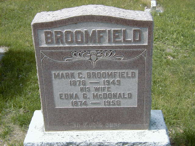 Edna Gertrude McDonald was born on 29 July 1874 at Cramahe Twp., Northumberland Co., Ontario; Date 1874 per Memorial. Date c. 1875 & location Cramahe Twp. per family tree of dougsly1 on ancestry.ca, Aug 14 2018. Date JUly 29 1874 & locatiion England per family tree of Dan Pearson on ancestry.ca, Dec 13 2019.1,2 As of circa 1895,her married name was Broomfield.1 She married Mark Cowey Broomfield, son of Robert Laing Broomfield and Mary Grey Cowey, circa 1895 at Ontario; per Memorial.1 Edna Gertrude McDonald died on 17 May 1956 at Cobourg, Northumberland Co., Ontario, at age 81; Date 1956 per Memorial. Date May 17 1956 & location Cobourg per family tree of Dan Pearson on ancestry.ca, Dec 13 2019.1,2 She was buried on 19 May 1956 at Vernonville Cemetery, Haldimand Twp., Vernonville, Northumberland Co., Ontario; Memorial: (See Exhibit) BROOMFIELD; Mark C. Broomfield; 1876 - 1949; His Wife; Edna G. McDonald; 1874 - 1956 (Vernonville Cemetey, Haldimand Twp., May 23 2005.)1