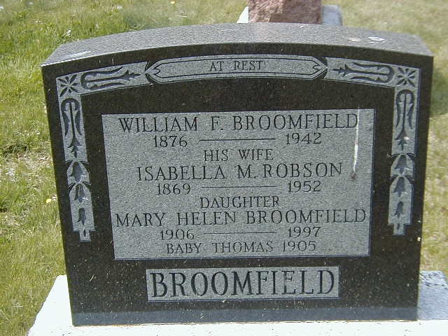per 1901 Census. per Memorial.1,5,6 Isabella Mary "Bella" Robson appeared on the census of 1911 at Haldimand Twp., Northumberland Co., Ontario; Age 41 at 1911 Census: see William F. Broomfield.3 She died in 1952; Date 1952 per Memorial.1 She was buried in 1952 at Vernonville Cemetery, Haldimand Twp., Vernonville, Northumberland Co., Ontario; Memorial: (See Exhibit) William F. Broomfield; 1876 - 1942; His Wife; Isabella M. Robson; 1869 - 1952; Daughter; Mary Helen Broomfield; 1906 - 1997; Baby Thomas 1905; BROOMFIELD (Vernonville Cemetery, Haldimand Twp., May 23 2005.)1