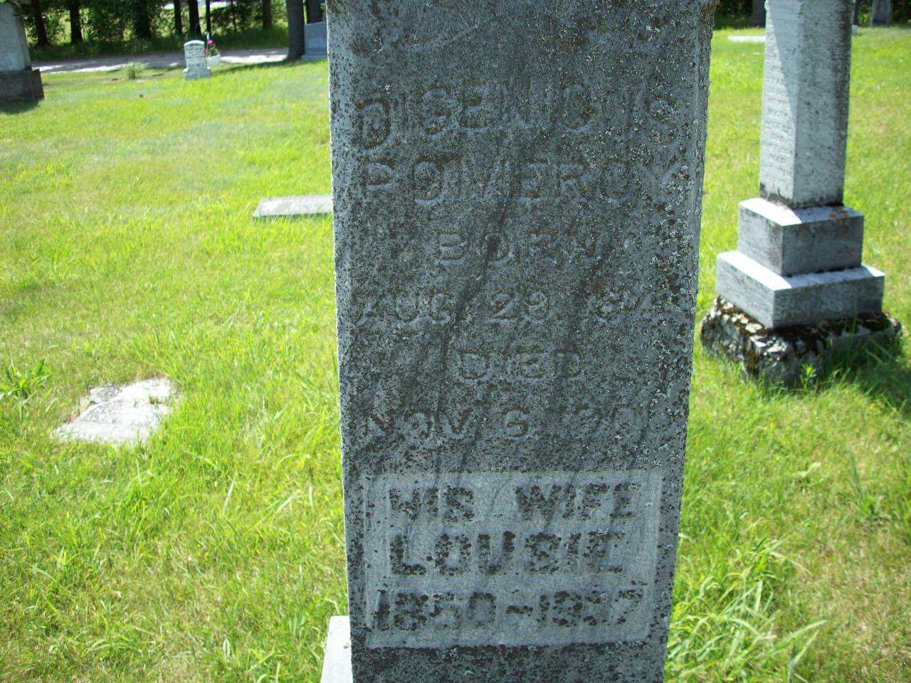 Diogenes Pomeroy was born on 29 August 1841 at Cramahe Twp., Northumberland Co., Canada West; DAte Aug 29 1841 per Memorial. Date Aug 29 1841 & location Ont. rural per 1901 Census. Date 1848 & location Ont. per 1881 Census. Date 1849 & location Ont. per 1871 Census. Date 1843 & location UC per 1861 Census. Date 1841 & location Cda. per 1851 Census. Date 1846 & location Cramahe per marr. reg'n. per marriage reg'n. of daughter Edith (Pomeroy) Warner. Date Aug 29 1841 & location Cramahe Twp. per GEDCOM of Carole Sprickerhoff, March 29, 2009.1,2,5,6,3,7,4,8 He appeared on the census of 1852 at Cramahe Twp., Northumberland Co., Canada West; Age 10 at 1851 Census: see George Pomeroy.3 He appeared on the census of April 1861 at Cramahe Twp., Northumbmerland Co., Canada West; Age 18 at 1861 Census: see George A. Pomeroy.7 He appeared on the census of April 1871 at Cramahe Twp., Northumberland Co., Ontario; Age 22 at 1871 Census: see George Pomeroy.6 He lived on 25 October 1872 at Cramahe Twp., Northumberland Co., Ontario; Residence Cramahe per marr. reg'n.1 He married Lucy Tripp, daughter of Shernor Tripp and Electa Colman, on 25 October 1872 at Cramahe Twp., Colborne, Northumberland Co., Ontario; Marriage Reg'n.#009774: Groom: Digenes Pomeroy; Age: 26; Res. & Born: Cramahe; Status: bachelor; Occ.: yeoman; Parents: George & Rebecca Pomeroy; Bride: Lucy Tripp; Age: 21; Res.: Cramahe; Born: Lyn; Status: spinster; Parents: Shernor? & Electa Tripp; Wit.: Lorenzo Bettes, Cramahe & Maria Platt, Colborne; Date: Oct 25 1872; Place: Colborne; Rel.: Bapt. & EM; Performed by: Rev. C. A. Simpson, Colborne; Note: " This was not handed in in time for Reg'n. in last years report." (Ontario Marriage Registration, #009774-1873, ancestry.ca) Date 1872 & location Cramahe Twp. per GEDCOM of Carole Sprickerhoff, March 29, 2009. per marriage reg'n. of daughter Edit (Pomeroy) Warner.9,5 Diogenes Pomeroy appeared on the census of April 1881 at Cramahe Twp., Northumberland East Co., Ontario; Age 38 at 1881 Census: Pomeroy, Digenus, 38, b. Ont., Ger., Bapt., farmer, married; Lucy, 28, b. Ont., Irish, EM, married; Edth, 8, b. Ont., Ger., Bapt. (1881 Census: Cramahe Twp., Northumberland East Co., dist. 123, sub-dist. a, pg. 35, line 7 - ancestry.ca.)8 He lived in April 1901 at Conc 9 Lot 34, Cramahe Twp., Northumberland Co., Ontario; Residence per 1901 Census: Conc 9, Lot 34, Cramahe Twp.2 He appeared on the census of April 1901 at Cramahe Twp., Northumberland Co., Ontario; Age 59 at 1901 Census: Pomeroy, Diogenes, 59, b. Ont. r. Aug 29 1841, Ger., Bapt., farmer, married; Lucy, 49, b. Ont. r. Aug 28 1851, Irish, Meth., married; Warner, Jay, 26, b. Ont. r. Jul 19 1874, Ger., Meth., son-in-law, Cooper, son-in-law, married; Edith, 27, b. Ont. r. Feb 2 1874, Ger., Meth., daughter, married (1901 Census Online: Cramahe Twp., dist. 95, sub-dist. e-5, pg. 13, line 16, T-6485 - Conc 9, Lot 34, S pt.)2 He died on 6 November 1905 at Cramahe Twp., Northumberland Co., Ontario, at age 64; Date Nov 6 1905 per Memorial. per GEDCOM of Carole Sprickerhoff, March 29, 2009.5,4 He was buried on 8 November 1905 at Castleton Cemetery, Castleton, Northumberland Co., Ontario; Memorial: (See Exhibit) Digenius; Pomeroy; Born; Aug. 29, 1841; Died; Nov. 6, 1905; His Wife; Louisie; 1850-1937 (Castleton Cemetery, Castleton, July 13 2009.)4