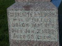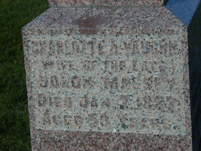 CEMSearch: Name: Charlotte A. Massey; Maiden: Vaughan; Born: 1836-06-30; Died: 1887-01-02; Age: 50y; Notes: 2nd Wife of Solon Massey (Massey History); Buried: Acadamey Hill Cemetery, Haldimand Twp; Other names: Esther Massey (Fraser) (1833-1867), Janet R. Massey (Massey) ( -1866), John Wesley Massey (1873-1878), Jonathan Massey ( -1837), Jonathan Massey (1792-1834), Rachel C. Massey (Massey) (1876-1878), Rachel Massey (Merrill) (1795-1878), Samuel massey ( -1813), Solon I. Massey (1860-1861), Solon Massey (1829-1881), William Fletcher Massey ( -1876), William James Massey (1872-1878.)1,3