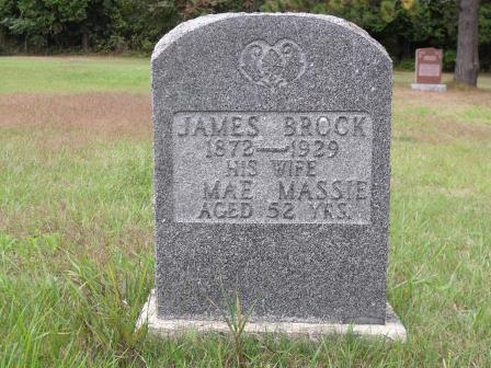 Note: Both her father and mother had died in the 1880's so she is living with the young family of her older brother.6 As of 17 August 1903,her married name was Brock.4 She married James Alexander Brock, son of Thomas Brock and Mary Elizabeth Marshall, on 17 August 1903 at Cobourg, Northumberland Co., Ontario; Marriage Reg'n.#013877: Groom: James Alexander Brock; Age: 31; Res.: Haldimand Twp; Born: Hamilton Twp; Status: bachelor; Occ.: farmer; Parents: Thomas Brock & Mary Marshall; Bride: Chloe Rebecca May Massey; Age: 24; Res.: Halidmand; Born: Hamilton Twp; Status: spinster; Parents: Solon Massey & Charlotte Bond; Wit.: Isaac & Mary E. Brock, Haldimand; Date: Aug 17 1903; Place: Cobourg; Rel.: Anglican & Meth; Performed by: H. T. Lewis; Reg'd.: Aug 25 1903 (Ontario Marriage Registration, #013877-1903, ancestry.com.)7 Chloe Rebecca "May" Massey died on 26 September 1914 at Haldimand Twp., Northumberland Co., Ontario, at age 34; Death Reg'n.#022374: Name: May Brock; Date: Sep 26 1914; Age: 35y; Res. & Born: Haldimand; Status: married; Parents: Solon Massey & Charlotte Ann Vaughan; Cause: resperatory failure; Phys.: Dr. Harold E. Brown, Roseneath; Inf.: Lucky Simpson, B...?; Reg'd.: Sep 28 1914 (Ontario Death Registration, #022374-1914, ancestry.com.)8 She was buried on 28 September 1914 at Bowmanton Cemetery, Haldimand Twp., Bowmanton, Northumberland Co., Ontario; Memorial: (See Exhibit) James Brock; 1872 - 1929; His Wife; Mae Massie; Aged 52 Yrs. (Bowmanton Cemetery, Haldimand Twp. - picture sent to me via email by Dianne Brock, May 8 2011.
