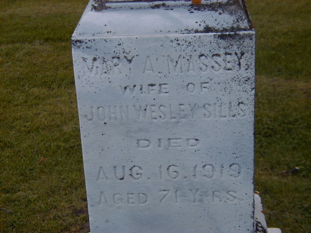 per GEDCOM of James A. McKane, May 5, 2007.2,7 Mary Adelaide Massey appeared on the census of April 1881 at Thurlow Twp., Hastings Co., Ontario; Age 33 at 1881 Census: see John W. Sills.3 She appeared on the census of April 1901 at 155 Sydenham St., Kingston, Frontenac Co., Ontario; Age 53 at 1901 Census: Sills, Mary A., 53, b. Ont. r. Dec 23 1847, Eng., Meth., Boarding House, widow; Minnie G., 28, b. Ont. r. Nov 30 1872, daughter, miliner, single; Helen L., 20, b. Ont. r. Jan 17 1880, daughter, single; Robert S., 19, b. Ont. r. Oct 4 1881, son (1901 Census Online: Kingston, dist. 77, sub-dist. b-1, pg. 25, line 42, T-6476 - 155 Sydenham St.)4 She died on 16 August 1919 at Ontario at age 71; Date Aug 16 1919 per Memorial. Date Aug 16 191 per pg. 9 of "The Massey Family 1591-1961" Compiled by Marian Massey Nicholson, copy provided to me by Lawrence Massey of Morganston, Ont., July 2, 2007. Date Aug 16 1919 per GEDCOM of James A. McKane, May 5, 2007.2,5,6 She was buried on 18 August 1919 at Foxboro Cemetery, Thurlow Twp., Foxboro, Hastings Co., Ontario; Memorial: (See Exhibit) Mary A. Massey; Wife of; John Wesley Sills; Died; Aug. 16, 1919; Aged 71 Years (Foxboro Cemetery, Foxbor, Jun 22 2006.)5