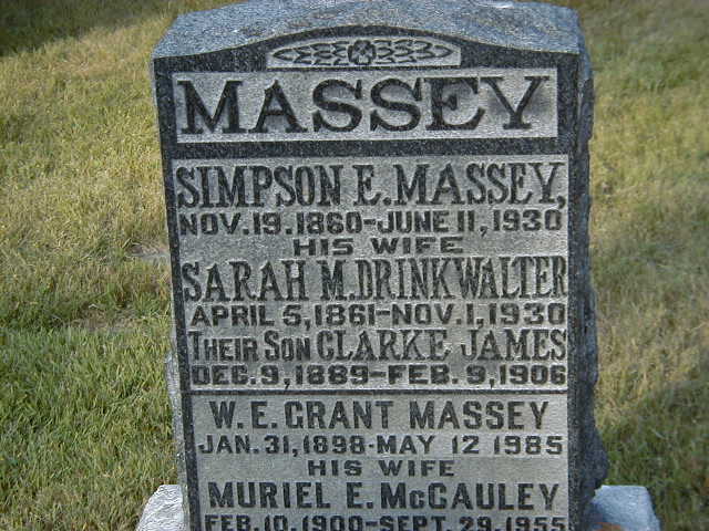 CEMSearch: Name: William Edward Grant Massey; Born: 1898-01-31; Died: 1985-05-12; Age: 87y 3m 12d; Notes: Husband of Muriel (McAuley) Massey, father of Thomas, Vera, jean, Helen, Audrey, Leona and Carman, son of Simpson Elon and Sarah Maria (Drinkwalter) Massey; Buried: Baltimore United Cemetery, Sec BE Row 19 Plot 4WA; Other names: Clarke James Massey (1889-1906, Irene Dorothy Wilson (Wilson) (1927-1932), Mabel Esther Wilson (Massey) (1886-1915), Muriel Ereta Massey (McCaulty) (1900-1955), Sarah Maria Massey (Drinkwalter) (1861-1930), Simpson Elon Massey (1860-1930), Spray Minnie Wilson (Massey) (1888-1973), William Lawrence Wilson (1888-1932.)1,4
