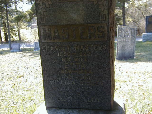 CEMSearch: Name: William Wesley Masters; Born: 1884; Died: 1953; Notes: Son of Chauncey and Etta Masters; Buried: Castleton Cemetery, Cramahe Twp., Sec 084; Other names: ? Masters (1932-1932, Arthur William Masters (1915-1977), Chauncey Masters (1856-1922), Clara Myrtle Masters (1924-1929), Etta Masters-White (Bright)(1866-1954), Georgie Hayden Masters (1927-1942), Jessie Ellen Masters (?)(1890-1975), John Francis Masters (1917-1980.)1,6