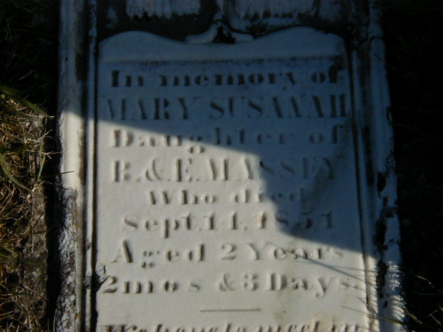 Mary Susanna Massey was born on 8 July 1849 at Haldimand Twp., Northumberland Co., Ontario; Date Jul 8 1849 per Memorial - age 2y 2m 3d at death Sep 11 1851. Date Jul 1849 per CEMSearch. Date Jul 1849 per GEDCOM of James A. McKane, May 5, 2007. per pg. 11 of "The Massey Family 1591-1961" Compiled by Marian Massey Nicholson, copy provided to me by Lawrence Massey of Morganston, Ont., July 2, 2007.1,2,3,4,5 She died on 11 September 1851 at Haldimand Twp., Northumberland Co., Ontario, at age 2; Date Sep 11 1851 per Memorial. Date Sep 14 1851 per GEDCOM of James A. McKane, May 5, 2007. per pg. 11 of "The Massey Family 1591-1961" Compiled by Marian Massey Nicholson, copy provided to me by Lawrence Massey of Morganston, Ont., July 2, 2007.1,2,3,5 She was buried on 13 September 1851 at Haldimand Twp., Grafton, Northumberland Co., Ontario; Memorial: (See Exhibit) In Memory of; Mary Susanah; Daughter of; B. & E. Massey; Who Died; Sept. 11, 1851; Aged 2 Years; 2 Mos & 3 Days (Academy Hill Cemetery, Haldimand Twp., April 28, 2007)
