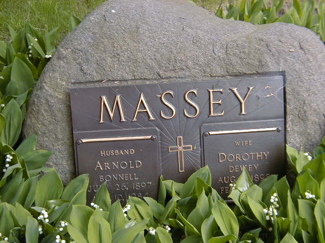 Arnold Bonnell Massey was born on 26 July 1897 at Toronto, York Co., Ontario; Date Jul 26 1897 per Memorial. Date Jul 26 1897 & location Ont. urban per 1901 Census. per GEDCOM of James A. McKane, May 7, 2007.1,2,3 He appeared on the census of April 1901 at 400 Bloor St., W. (Ward 4), Toronto, York West Co., Ontario; Age 4 at 1901 Census: see Mary Bonnell (grandmother.)2 He married Dorothy Dewey circa 1920; per GEDCOM of James A. McKane, May 7, 2007.1 Arnold Bonnell Massey died on 10 April 1984 at age 86; Date Apr 10 1984 per Memorial.3 He was buried on 13 April 1984 at Massey Mauseleum, Mount Pleasant Cemetery, Toronto, York Co., Ontario; Memorial: (See Exhibit) MASSEY; Arnold; Bonnell; July 26, 1897; Apr. 10, 1984; Wife; Dorothy; Dewey; Aug. 2, 1898; Feb. 9, 1983 (Massey Mauseleum (plaque on stone outside mauseleum), Mount Pleasant Cemetery, Toronto, May 26, 2007.)3