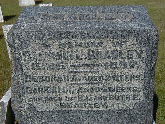 Baldwin Lorenzo Bradley was born on 3 April 1826 at Haldimand Twp., Northumberland Co., Upper Canada; Date 1826 per Memorial. Date 1826 & location Ont. per 1891 Census. Date 1826 & location Ont. per 1871 Census. Date 1826 & location Haldimand UC per 1861 Census. Date 1826 & location Cda. per 1851 Census. Date Apr 3 1826 per GEDCOM of Katie Sweet, May 21, 2007.1,3,4,5,6,7 He married Ruth Emeline Hubble, daughter of Peter Hubble and Clara Guernsey Merriam, on 23 March 1847 at Hastings Co., Ontario; Marriage Register: Groom: ? Bradley; Bride: Ruth Emeline Hubble; Date: 23 March 1847; By Bans; Wit.: Wesley Bradley & Thomas ?Butler? (Ontario Marriage Registers, Marriages by the Rev. Robert Earl, in the office of the Clerk of Peac, Sep 2 1847, Victoria District 1839-1858 - ancestry.com) per 1861 Census. per GEDCOM of Katie Sweet, May 21, 2007.1,5,8 Baldwin Lorenzo Bradley appeared on the census of 1851 at Haldimand Twp., Northumberland Co., Ontario; Age 25 at 1851 Census: Bradley, Lorenzo, 25, b. Cda., Chr., Blacksmith, married; Emaline, 22, b. Cda., Chr., married; Peter W., 4; Romsby, George, 8 (1851 Census: Haldimand Twp., Northumberland Co., pg. 121 of 163, line 23 - ancestry.com.)6 He appeared on the census of April 1861 at St. James Ward, Toronto, York Co., Ontario; Age 35 at 1861 Census: Bradley, B. ?(m) , 35, b. Haldimand, UC, Christian Conference, Medical Student, married; R. E.(f), 32, b. Rawdon, UC, Chr., married; Wesley, 13, b. Haldimand UC, son; ?W. A.?(f), 9; A.(f), 6; Newel(m), 3; E. C.(f), 2 (1861 Census: Toronto, York Co., St. James Ward, Dist. 6, pg. 499 of 751, line 1 - ancestry.com.)5 He appeared on the census of April 1871 at Woodstock, Oxford North Co., Ontario; Age 45 at 1891 Census: Bradley, Baldwin, 45, b. Ont., Irish, WM, Physician, married; Ruth, 42, b. Ont., - , WM, married; ?Annetta?(f), 15; Newell, 13; Clarindice?(f), 11 (1871 Census: Woodstock, Oxford North Co., pg. 89, line 11 - ancestry.com.)4 He lived in 1875 at Dundas St., Woodstock, Oxford Co., Ontario; "Bradley, Baldwin, L. M. D., physician and surgeon, Dundas St." Oxford Co. Directory, 1874-1875, pg. 97 (56 of 107) - ancestry.com.9 He appeared on the census of April 1891 at Woodstock, Oxford North Co., Ontario; Age 65 at 1891 Census: Bradley, Baldwin L., 65, b. Ont., p.b. US, Meth., Physician, married; Ruth E., 61, b. Ont., p.b. US, Meth., married; Dawson, Blanche, 20, b. US, p.b. US, Meth., GR?, single (1891 Census: Woodstock, Oxford North Co., dist. 107, sub-dist. 7-4, pg. 39, line 22 - ancestry.com.)3 He was buried in 1897 at Eddystone Cemetery, Haldimand Twp., Northumberland Co., Ontario; Memorial: (See Exhibit) In Memory of; Baldwin L. Bradley; 1826 - 1897; Deborah A. aged 2 weeks; Garibaldi, aged 5 weeks; Children of B.L. and Ruth E; Bradley (Eddystone Cemetery, Haldimand Twp., Jun 9 2007.)7 He died in 1897 at Ontario; Date 1897 per Memorial. Date 1897 per GEDCOM of Katie Sweet, May 21, 2007 & per family tree of tylerERIKA2 on ancestry.com, Feb 4 2014.1,2,7