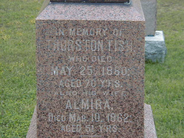 Thurston Fish was born in 1804 at Trenton, Oneida Co., New York, U.S.A; Date 1803 & location USA per 1851 Census. Date 1804 per GEDCOM of Katie Sweet, May 21, 2007. Date 1804 & location Trenton, Oneida Co., NY per GEDCOM of Joseph Shaw, June 9, 2007. Date 1804 per Memorial.1,2,3 He married Almira S. Bradley, daughter of William Harnden Bradley and Deborah Tripp, before 1830 at Haldimand Twp., Northumberland Co., Upper Canada; per 1851 Census. per GEDCOM of Katie Sweet, May 21, 2007.1,2 Thurston Fish lived on 9 April 1839 at Conc 4 Lot 25, Haldimand Twp., Northumberland Co., Upper Canada; Land Registry Records (B&S 5486) show that Samuel Massey sold 114 acres of S pt. of Lot 25, Conc 4, Haldimand Twp. to Thurston Fish, Inst. Date Apr 9 1839.4 He appeared on the census of 1851 at Haldimand Twp., Northumberland Co., Canada West; Age 48 at 1851 Census: Fish, Thurston, 48, b. USA, Bapt., farmer, married; Almira, 42, b. Cda., Bapt., married; Minerva Ann, 20, b. Cda; Wm. J., 15; Deborah, 13; Charles, 7; Anna, 71, b. USA, EM, widow; McGaly, David, 19, b. Cda., lab; Fish, Lydia, 30, b. Cda., Bapt; Dodd, Margaret, 18, b. Ireland, EM, servant; Nobles, Whitman, 37, b. USA, teacher, Christian (1851 Census Online: Haldimand Twp., pg. 149 of 163, line 2 - ancestry.com.)2 He married Lucy Williams, daughter of Samuel Williams and Lucy Wait, on 12 November 1862 at Haldimand Twp., Northumberland Co., Canada West; Marriage Register: Groom: Thurston Fish; Age: 58; Res.: Haldimand Twp; Born: USA; Parents: Ebenezar & Anna Fish; Bride: Lucy Bennett; Age: 56; Res. & Born: Haldimand; Parents: Samuel & Lucy Williams; Date: Nov 12 1862; Place: Haldimand Twp; Mf: 1030061 (Ontario Marriage Registers, 1857-1922 - ancestry.com.)5 Thurston Fish appeared on the census of April 1871 at Haldimand Twp., Northumberland Co., Ontario; Age 66 at 1871 Census: Fish, Thurston, 66, b. Ont., Eng., Bapt., farmer, married; Lucy, 63, b. Ont., Eng., Bapt., married; Lydia, 52, b. Ont., Eng., Bapt., single; smith, Caroline, 20 (1871 Census; Haldimand Twp., div. 1, pg. 4, line 17 - Conc 1 Lot 1, 107 acres, employee.)6 He lived in April 1871 at Conc 1 Lot 1, Haldimand Twp., Northumberland Co., Ontario; Residence per 1871 Census: Conc 1 Lot 1, Haldimand Twp., 107 acres, employee.6 He died on 25 May 1880 at Haldimand Twp., Grafton, Northumberland Co., Ontario; Date May 25 1880 per Memoria. per GEDCOM of Katie Sweet, May 21, 2007.1,3 He was buried on 27 May 1880 at Fairview Cemetery, Haldimand Twp., Northumberland Co., Ontario; Memorial: (See Exhibit) In Memory of; Thurston Fish; Who Died; Mary 25, 1880; Aged 76 Yrs; Also His Wife; Almira; Died Mar 10, 1862; Aged 51 Y'rs (Academy Hill Cemetery, Haldimand Twp., July 9, 2004)