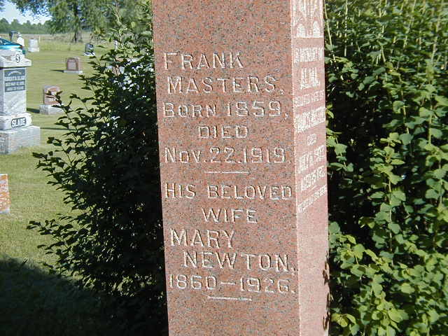 CEMSearch: Name: Mary Masters; Maiden: Newton; Born: 1860; Died: 1926; Age: 62y; Notes: Wife of Frank Masters; Buried: Centreton Cemetery, Haldimand Twp., Sec 06 Row 11; Other names: Alma Masters (Newton) (1878-1903), Frank Masters (1859-1919.)3,7