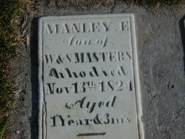 Manley E. Masters was born in August 1823 at Haldimand Twp., Northumberland Co., Upper Canada; Date Aug 1823 per Memorial.1 He died on 13 November 1824 at Haldimand Twp., Northumberland Co., Upper Canada, at age 1; Date Nov 13 1824 per Memorial. Date Nov 13 1824 per CEMSearch.1,2 He was buried on 15 November 1824 at Academy Hill Cemetery, Haldimand Twp., Northumberland Co., Upper Canada; Memorial: (See Exhibit) Manley E; Son of; W. & S. Masters; Who died; Nov. 13th, 1824; Aged; 1 Year & 3 m's (Academy Hill Cemetery, Haldimand Twp., apr 28, 2007)