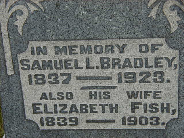 Elizabeth Fish was born in 1839 at New York, U.S.A; Date 1839 & location New York State per 1861 Census. Date 1839 per GEDCOM of Robert Young, June 10, 2007.1,2 As of circa 1860,her married name was Bradley.1 She married Samuel Lemuel Bradley, son of Abraham Harnden Bradley and Ruth Tucker, circa 1860 at Haldimand Twp., Eddystone, Northumberland Co., Canada West; Samuel and Elizabeth are married per 1861 Census. per GEDCOM of Robert Young, June 10, 2007.1,2 Elizabeth Fish appeared on the census of April 1861 at Haldimand Twp., Northumberland Co., Canada West; Age 22 at 1861 Census: see Abraham H. Bradley (father-in-law.)2 She lived on 26 June 1873 at Haldimand Twp., Northumberland Co., Ontario; Witness at marriage of Abraham Harnden Bradley & Sarah (Tucker) Bradley - she had been wife of Sylvanus Bradley.3 She was buried in 1903 at Eddystone Cemetery, Haldimand Twp., Eddystone, Northumberland Co., Ontario; Memorial: (See Exhibit) In Memory of; Samuel L. Bradley; 1837 - 1923; Also His Wife; Elizabeth Fish; 1839 - 1903 (Eddystone Cemetery, Haldimand Twp., June 9, 2007.)4 She died in 1903 at Ontario; Date 1903 per Memorial.4 She lived on 7 September 1923 at Haldimand Twp., Grafton, Northumberland Co., Ontario; Informant for Death Reg'n. of husband Samuel Bradley.5
