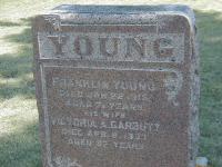 Franklin Young was born on 31 March 1842 at Prince Edward Co., Canada West; Date Mar 31 1842 & location Prince Edward Co. per Death Reg'n. - age 70y 9m 22d at death Jan 22 1913. Date 1842 per Memorial. Date Mar 30 1842 & location Ont. rural per 1901 Census. Date 1842 & location Prince Edward Co. per marriage register.1,2,3,4 He lived on 8 December 1864 at Prince Edward Co., Canada West; Residence Prince Edward Co. per marriage register.4 He married Victoria Adelaide Garbutt, daughter of John Garbutt and Rachael Bush, on 8 December 1864 at Haldimand Twp., Northumberland Co., Canada West; Marriage Register: Groom: Franklin Young; Age: 22; Res. & Born: Prince Edward Co; Parents: David & Rebecca Young; Bride: V. A. Garbut; Age: 19; Res.: Percy Twp; Born: Cramahe Twp; Parents: John & Rachel Garbut; Date: Dec 8 1864; Place: Haldimand Twp. (Ontario Marriage Register, ancestry.com) per Memorial.1,4 Franklin Young lived in April 1901 at Conc 5 Lot 16, Percy Twp., Northumberland Co., Ontario; Residence per 1901 Census: Conc 5, Lot 16, Percy Twp.3 He appeared on the census of April 1901 at Percy Twp., Northumberland Co., Ontario; Age 59 at 1901 Census: Young, Franklin, 59, b. Ont. r. Mar 30 1842, Dutch, Meth., farmer, married; Victoria A., 55, b. Ont. r. Dec 8 1845, Eng., Meth., married; Jesse J., 27, b. Ont. r. Aug 8 1873, son; ?Unite?, Rachael, 80, b. Ont. r. Jun 10 1820, Dutch, mother-in-law, widow (1901 Census Online: Percy Twp., dist. 95, sub-dist. h-2, pg. 5, line 43, T-6485 - Conc 5, Lot 16, E 1/2.)3 He died on 22 January 1913 at Percy Twp., Northumberland Co., Ontario, at age 70; Death Reg'n.#024300: Name: Franklin Young; Date: Jan 22 1913; Age: 70y 9m 22d; Res.: Percy Twp; Born: Prince Edward Co; Status: married; Occ.: farmer; Parents: Daniel Young & Rebecca Hicks; Cause: paralysis of bowel; Phys.: James. W. Richards, MD, Warkworth; Inf.: Jesse J. Young, Warkworth; Reg'r.: Jan 22 1913 (Ontario Death Registration, #024300-1913, ancestry.com)