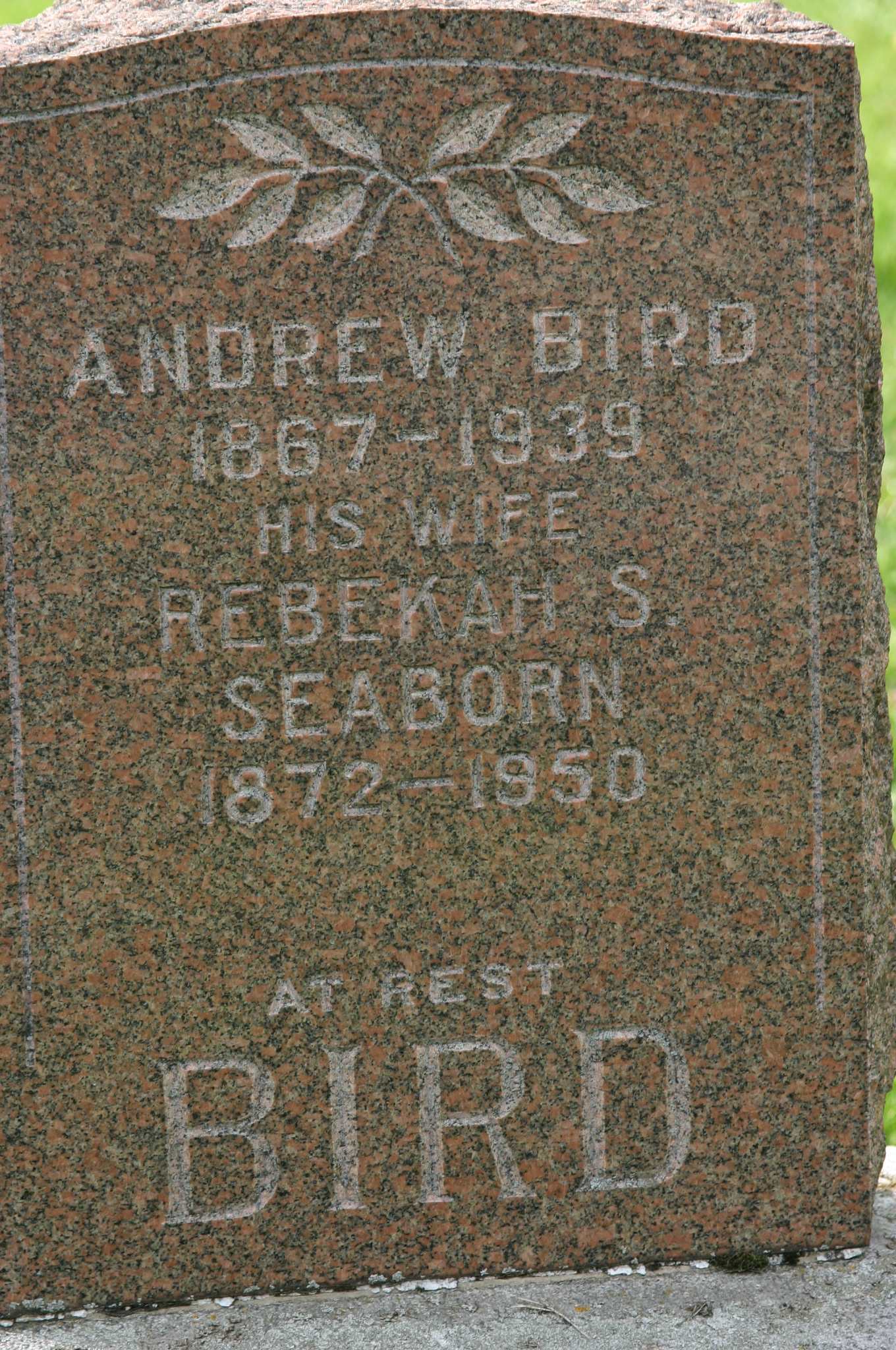 CemSearch: Name: Rebekah S. Seaborn; Born: 1872; Died: 1950; ID: 469415; Other names: Bird, Andrew (1867-1939); Cemetery: Mount Hope Cemetery, Brighton, Sec 2 Row 11 (http://www.cemsearch.ca/burial/?action=sameStoneGroup&selSameStoneChoice=469415.)3,2