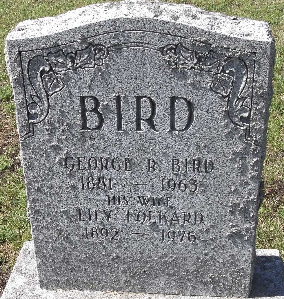 CemSearch: Name: Lily Bird; Maiden: Folkard; Born: 1892; Died: Mar 11 1975; ID: STOCK73; Other names: Bird, George Reid (1881-1963); Cemetery: Stocikdale Cemetery, Conc 6 Lot 3, Murray Twp., Northumberland Co; Note: Born London England; died Trenton. Daughter of Frederick and Emily Folkard; wife of George R. Bird; mother of James, Maurice, and Douglas; sister of Fred. (https://www.cemsearch.ca/burial/?pid=STOCK73%5E1.)4,11,5