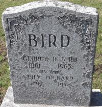 Note: Bride's surname is clealry spelled as Falkard in the Marriage Reg'n., although it is spelled as Folkard on the memorial and in FindaGrave and Cemsearch.1,9 As of 1 April 1919,her married name was Bird.1 Lily Folkard lived on 1 April 1919 at Toronto, York Co., Ontario; Residence Toronto per marriage reg'n.2 She appeared on the census of 1921 at Camden Twp., Lennox & Addington Co., Ontario; Age 26 at 1921 Census: see George Bird.3 She lived on 18 September 1963 at Trenton, Hastings Co., Ontario; Husband George Reid Bird died in Trenton Sep 18 1963.10 She lived in 1968 at R. R. # 2, Frankford, Hastings Co., Ontario; "3 Bird, Maurice, farmer, R.R. No. 2, Frankford" & "4 Bird. Mrs. Maurice - R.R. 2, Frankford" & "5 Bird, Mrs. George, widow, R.R. No. 2, Frankford" Canada Voters Lists, 1968, Prince Edward-Hastings, pg 730 of 806, ancestry.ca.7 She died on 11 March 1976 at Ontario at age 84; Date 1976 per Memorial. Date March 11 1976 per CemSearch. Date Mar 11 1976 per GEDCOM of Gareld R. McEathron, June 26, 2007.1,4,5,11 She was buried on 13 March 1976 at Stockdale Cemetery, Stockdale, Northumberland Co., Ontario; Memorial: (See Exhibit) BIRD; George R. Bird; 1881 - 1963; HIs Wife; Lilly Folkard; 1892 - 1976 (Stockdale Cemetery, Stockdale, image from FindaGrave.)