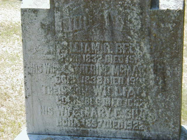 William J. Bell was born on 15 March 1866 at Brighton Twp., Northumberland Co., Canada West; Date 1866 & location Ont. per 1921 Census. Date Mar 15 1865 & location Ont. rural per 1901 Census. Date 1866 & location Ont. per 1891 Census. Date 1866 & location Ont. per 1871 & 1881 Census. Date 1864 & location Brighton Twp. per marr. reg'n. Date 1866 per Memorial & CEMSearch.1,2,3,4,5,6,7,8 He appeared on the census of April 1871 at Brighton Twp., Northumberland Co., Ontario; Age 5 at 1871 Census: see William Bell.3 He appeared on the census of April 1881 at Brighton Twp., Northumberland Co., Ontario; Age 15 at 1881 Census: see William Bell.4 He married Mary Elizabeth Sharpe, daughter of Jacob Sharp and Samantha White, on 23 December 1885 at Brighton Twp., Hilton, Northumberland Co., Ontario; Marriage Reg'n.#008302: Groom: William J. Bell; Age: 21; Res. & Born: Brighton Twp; Status: bachelor; Occ.: farmer; Parents: William & Catherine Bell; Bride: Mary Elizabeth Sharp; Age: 26; Res. & Born: Murray Twp; Status: spinster; Parents: Jacob & Samantha Sharp; Wit.: Sanford Sharp, Murray & Cassie Bell, Brighton; Date: Dec 23 1885; Place: Hilton; Rel.: Episc. & Meth; Performed by: S. H. Dupreau (Ontario Marriage Registration, #008302-1885, ancestry.com.)2,9 William J. Bell appeared on the census of April 1891 at Brighton Twp., Northumberland Co., Ontario; Age 25 at 1891 Census: Bell, William, 25, b. Ont., p.b. Eng. & ONt., Meth., farmer, married; Elizabth, 27, b. Ont., p.b. - & Ont., Meth., married; Arthur, 4, b. Ont., p.b. Ont. (1891 Census: Brighton Twp., pg. 7, line 9.)7 He lived in April 1901 at Conc 5 Lot 25, Brighton Twp., Northumberland Co., Ontario; Residence per 1901 Census: Conc 5, Lot 25, Brighton Twp.6 He appeared on the census of April 1901 at Brighton Twp., Northumberland Co., Ontario; Age 36 at 1901 Census: Bell, William J., 36, b. Ont. r. Mar 15 1865, Eng., Meth., married; Mary E., 41, b. Ont. r. Dec 2 1859, Eng., Meth., married; Arthur, 14, b. Ont. r. Mar 27 1887, son; Bertha M., 6, b. Ont. r. Aug 22 1894, daughter; William R., 69, b. England Feb 6 1832, immig. 1848, Meth., retired farmer, married; Catherine, 64, b. Ont. r. Feb 6 1837, Irish, Meth., married (1901 Census Online: Brighton Twp., dist. 95, sub-dist. a-4, pg. 8, line 20, T-6485 - Conc 5, Lot 25.)6 He lived on 4 February 1918 at Brighton Twp., Hilton, Northumberland Co., Ontario; Informant for Death Reg'n. of his father William R. Bell.10 He appeared on the census of 20 June 1921 at Brighton Twp., Northumberland Co., Ontario; Age 55 at 1921 Census: Bell, William, 55, b. Ont., p.b. England & Ont., Eng., Meth., farmer, married; Mary, 64, b. Ont., p.b. Ont., Eng., Meth., married (1921 Census: Brighton Twp., Northumberland Co., dist. 107, sub-dist. 5, pg. 8, line 6 - ancestry.ca.)8 He lived on 6 December 1922 at Brighton Twp., Hilton, Northumberland Co., Ontario; Informant for Death Reg'n. of his wife Mary Elizabeth (Sharpe) Bell.10 He was buried in 1952 at Wooler Friends Cemetery, Brighton Twp., Northumberland Co., Ontario; Memorial: (See Exhibit) William R. Bell; Born 1832 Died 1913; His Wife Chatherine McMaster; Born: 1838 Died 1918; Their Son William; Born 1866 Died 1952; His Wife Mary E. Sharpe; Born 1857 Died 1922 (Wooler Friends Cemetery, Brighton Twp.)1,2 He died in 1952 at Ontario; Date 1952 per Memorial & CEMSearch.1,2