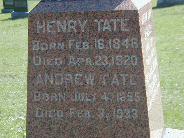 CEMSearch: Name: Henryt Tate; Born: 1848-02-16; Died: 1920-04-23; Buried: Codrington Romand Catholic Cemetery, Conc 5, Lot 34, Brighton Twp., Old Wooler Road; Other names: Andrew Tate (1855-1933), Hugh Tate ( -1878), James Tate (1847-1944), Margaret Tate (1852-1943), Mary Ann Tate (McAuley) ( -1887.)6,7