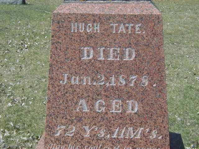 Hugh Tate was born in 1806 at Ireland; Date 1806 per Memorial. Date 1804 & location Ireland per 1871 Census. Date 1807 & location Ireland per 1861 Census. per marriage reg'n. of daughter Mary (Tate) Marsh.1,2,3,4 He married Mary Ann McAuley before 1842; per 1871 Census. per marriage reg'n. of daughter Mary (Tate) Marsh.1 Hugh Tate lived on 20 August 1849 at Conc 7 Lot 35, Brighton Twp., Northumberland Co., Ontario; Land Registry Records (B&S A787) show that Adam H. Meyers sold the West Hald of Lot 35, Concession 7, Brighton Twp. to Hugh Tate. ITS Date Aug 20 1849. Reg. Date Mar 20 1858.5 He lived in 1850 at Conc 1 Lot 10, Murray Twp., Northumberland Co., Ontario; 1850 Census: Hugh Tate; Conc 1, Lot 10, unoccupied; non-prop; Total 6 Persons.