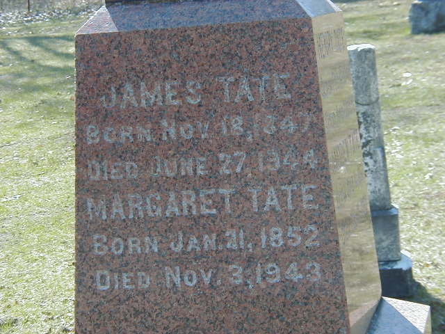 James Tate was born on 18 November 1847 at Ontario; Date Nov 18 1847 per Memorial. Date Nov 1845 & location Ont. per 1911 Census. Date Oct 19 1851 & location Ont. rural per 1901 Census. Date 1851 & location Ont. Census. Date 1852 & location Ont. per 1881 Census. Date 1849 & location Ont. per 1871 Census. Date 1848 & location UC per 1861 Census.1,2,3,4,5,6,7,8 He appeared on the census of April 1861 at Brighton Twp., Northumberland Co., Ontario; Age 13 at 1861 Census: see Hugh Tate.1 He appeared on the census of April 1871 at Brighton Twp., Northumberland Co., Ontario; Age 22 at 1871 Census: see Hugh Tate.2 He lived in 1878 at Conc 6 Lot 35, Brighton Twp., Northumberland Co., Ontario; County Atlas: Name: James Tate; Township: Brighton; County: Northumberland; Date: 1878; Conc & Lot: VI, 35 - 100 acres.9 He lived on 4 January 1878 at Brighton Twp., Northumberland Co., Ontario; Informant for Death of Hugh Tate, 11 years old - not sure who his parents are - doesn't seem to fit with any of his siblings.????
