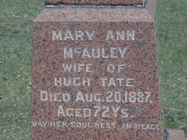 CEMSearch: Name: Mary Ann Tate; Maiden: McAuley; Born: - ; Died: 1887-08-20; Age: 72y; Buried: Codrington Romand Catholic Cemetery, Conc 5, Lot 34, Brighton Twp., Old Wooler Road; Other names: Andrew Tate (1855-1933), Henry Tate (1848-1920), Hugh Tate ( -1878), James Tate (1847-1944), Margaret Tate (1852-1943.)2,6