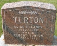 Alice Delaney was born on 20 May 1859 at Murray Twp., Northumberland Co., Canada West; Date 1850 per Memorial & CemSearch. Date May 20 1859 & location Murray Twp. per Death Reg'n. Date 1871 & location Ont. per 1931 Census. Date 1872 & location Ont. per 1921 Census. Date 1863 & loction Ont. per 1916 Western Census. Date May 20 1859 & location Ont. rural per 1901 Census. Date 1856? & location Ont. per 1891 Census. Date 1861 & location Ont. per 1881 Census. Date 1859 & location Ont. per 1871 Census. Date 1857 & location UC per 1861 Census.1,2,3,4,5,6,7,8,9,10,11 She appeared on the census of April 1861 at Murray Twp., Northumberland Co., Canada West; Age 4 at 1861 Census: see Andrew Delaney.3 She appeared on the census of April 1871 at Brighton Twp., Northumberland Co., Ontario; Age 12 at 1871 Census: see Andrew Delaney.2 She appeared on the census of April 1881 at Brighton Twp., Northumberland Co., Ontario; Age 20 at 1881 Census: see Andrew Delaney.1 She appeared on the census of April 1891 at Brighton Twp., Northumberland Co., Ontario; Age 28? at 1891 Census: see Andrew Delaney.4 She appeared on the census of April 1901 at Brighton Twp., Northumberland Co., Ontario; Age 40 at 1901 Census: see Byron Delaney (brother.)5 She appeared on the census of circa April 1916 at Twp. 40 Range 4 M5, Red Deer Dist., Alberta; Age 53 at 1916 Western Census: see Daniel Delaney (brother.)7 As of circa June 1916,her married name was Turton.11 She married Albert Turton circa June 1916 at Red Deer, Alberta; Alberta Marriage Index: Name: Alice Delaney; Spouse: Albert Turton; Marriage Date: 1916; Marriage Place: Red Deer, Alberta; Cert.#: 2879 (Albert Marriage Index, ancestry.ca) per CemSearch.11,12 Alice Delaney appeared on the census of 1921 at Brighton Twp., Northumberland Co., Ontario; Age 49 at 1921 Census: see Albert Turton.8 She appeared on the census of 1931 at Brighton Twp., Northumberland Co., Ontario; Age 50 at 1931 Census: see Albert Turton.9 She lived in 1935 at R. R. 1, Hilton, Northumberland Co., Ontario; "279 Turton, Albert, farmer, R.R. 1, Hilton" & "280 Turton, Mrs. Albert, (W) married woman, R.R. 1, Hilton" Canada Voters Lists, 1935, Brighton Twp., pg. 10 of 126, ancestry.ca.13 She lived in January 1942 at Conc 3 Lot 33, Brighton Twp., Northumberland Co., Ontario; Residence before death Conc 3, Lot 33, Brighton Twp. per Death Reg'n.6 She died on 15 February 1942 at Belleville General Hospital, Belleville, Hastings Co., Ontario, at age 82; Death Reg'n.#019215: Name: Alice Turton; Date: Feb 15 1942; Age: 82y 8m 26d; Place: Belleville General Hospital, 3 weeks; Res.: Conc 3, lot 33, Brighton Twp; Nat.: Irish; Status; married; Occ.: farmer's wife, housekeeping; Spouse: Albert Turton; Parents: Andrew Delaney, b. Ont. & Sophia Abbot, b. Murray Twp; Inf.: Albert Turton, RR. R. 1, Hilton, husband; Burial: Carman Cemetery, Feb 17 1942; Und.: B. E. Brintnell, Brighton; Cause: cancer of bladder, old age; Phys.: Dr. T. Cronk?, Belleville; Reg'd.: Feb 17 1942; Reg'r.: J. Wilfred Holmes, Belleville (Ontario Death Registration, #019215-1942, ancestry.ca)