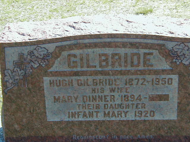 Mary A. Dinner was born in 1894 at Ziska, Ontario; Date 1894 & location Ziska per marr. reg'n. Date 1894 per Memorial.1,3 She lived on 19 February 1919 at Ziska, Ontario; Residence Ziska per marr. reg'n.1 As of 19 February 1919,her married name was Gilbride.1 She married Hugh Gilbride, son of John Gilbride and Jane Tate, on 19 February 1919 at Bracebridge, Muskoka Dist., Ontario; Marriage Reg'n.#017788: Groom: Hugh Gilbride; Age: 35; Res. & Born: Codrington; Status: bachelor; Occ.: farmer; Rel.: R.C; Parents: John Gilbride & Jane Tate?; Bride: Mary Dinner; Age: 25; Res. & Born: Ziska; Status: spinster; Occ.: teacher; Rel.: R.C; Parents: William Dinner & Julia Fitzmaurice; Wit.: William Cowan, Codrington & Mary Prentice?, North Bay; Date: Feb 19 1919; Place: Bracebridge (Ontario Marriage Registration, #017788-1919, ancestry.com.)4 Mary A. Dinner was buried circa 1980 at Codrington Catholic Cemetery, Brighton Twp., Northumberland Co., Ontario; Memorial: (See Exhibit) GILBRIDE; Hugh Gilbride 1872 - 1950; His Wife; Mary Dinner 1894 - --; Their Daughter; Infant Mary 1920 (Codrington Catholic Cemetery, Brighton Twp.)3 She died circa 1980 at Ontario; No date on Memorial.3