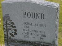 CEMSearch: Name: Jean Bound; Maiden: Thompson; Born: 1922-12-29; Died: 1995-07-24; Notes: Born Huntington Twp., daughter of Harry and Eliza (McInroy) Thompson, wife of George Bound, married Aug 27 1941, children Peter, June Jacobs (deceased) Bonnie and Doug; Buried: Warkworth Cemetery, Warkworth, Sec 1 Row E Plot 02; No other names.1,2