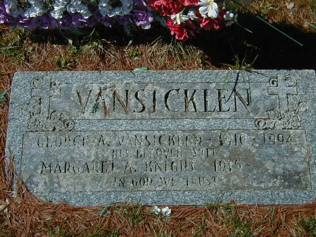 George A. Vansicklen was born on 11 July 1910 at Percy Twp., Norham, Northumberland Co., Ontario; Date Jul 11 1910 & location Ont. per 1911 Census.1 He appeared on the census of 1911 at Percy Twp., Norham, Northumberland Co., Ontario; Age 10 months at 1911 Census: see Charles Vansicklen.1 He was buried in 1994 at Warkworth Cemetery, Warkworth, Northumberland Co., Ontario; Memorial: (See Exhibit) VANSICKLEN; George A. Vansicklen 1910 - 1994; His Beloved Wife; Margaret A. Knight 1916 - - (Warkworth Cemetery, June 18, 2007.)2 He died in 1994; Date 1994 per Memorial.2