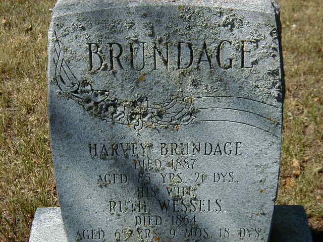 Harvey Brundage was born on 15 December 1802 at New York, U.S.A; Date 1802 & location "York State" per Death Reg'n. Date 1801 per Memorial - age 85y 21d at death 1887. Date 1802 & location US per 1871 Census. Date 1801 & location USA per 1861 Census. Date 1801 & location USA per 1851 Census. Location New York State per Death Reg'n. of daughter Hester Ann (Brundage) Jackson. Date Dec 15 1802 & location New York State per family tree of justnan2u on ancestry.com, July 11 2011. Date 1801 & location USA per GEDCOM of Elizabeth Archer, Nov 16 2009. per marriage register of daughter Sarah Brundage. Location New York per 1891 Census of sons John W. & William Brundage.1,2,3,4,5,6,7,8,9 He appeared on the census of 1823 at Conc 4 Lot 9, Murray Twp., Northumberland Co., Ontario; 1823 Assessment: Harvey Brundage; Conc 4, Lot 9, 88 acres uncult., 12 acres cult. He appeared on the census of 1823 at Murray Twp., Northumberland Co., Ontario; 1823 Census: Harvey Brundage; 1 male over 16; 2 females over 16. He appeared on the census of 1824 at Murray Twp., Northumberland Co., Ontario; 1824 Census: Harvey Brundage; 1 male over 16; 2 females over 16. He appeared on the census of 1824 at Conc 4 Lot 9, Murray Twp., Northumberland Co., Ontario; 1824 Assessment: Harvey Brundage; Conc 4, Lot 9, 75 acres uncult., 25 acres cult. He appeared on the census of 1825 at Murray Twp., Northumberland Co., Ontario; 1825 Census: Harvey Brundage; 1 male over 16; 2 females over 16; Total 3. He appeared on the census of 1825 at Conc 4 Lot 9, Murray Twp., Northumberland Co., Ontario; 1825 Assessment: Harvey Brundage; Conc 4, Lot 9, 70 acres uncult., 30 acres cult. He married Ruth Wessels, daughter of John Wessels and Eleanor ?, circa 1826 at Ontario; Date c. 1829 per GEDCOM of Elizabeth Archer, Nov 16 2009. per marriage register of daughter Sarah Brundage.1,2 Harvey Brundage appeared on the census of 1826 at Con 4 Lot 9, Murray Twp., Northumberland Co., Ontario; 1826 Census: Harvey Brundage; Conc 4, Lot 9, 70 acres uncult., 30 acres cult; 1 male over 16; 3 females over 16; Total 4. He appeared on the census of 1827 at Conc 4 Lot 9, Murray Twp., Northumberland Co., Ontario; 1827 Assessment: Harvey Brundage; Conc 4, Lot 9, 80 acres uncult., 20 acres cult. He appeared on the census of 1827 at Murray Twp., Northumberland Co., Ontario; 1827 Census: Harvey Brundage; 1 male over 16; 3 females over 16; Total 4. He appeared on the census of 1828 at Conc 4 Lot 9, Murray Twp., Northumberland Co., Ontario; 1828 Census: Harvey Brundage; Conc 4, Lot 9, 70 acres uncult., 30 acres cult; 1 male over 16; 3 females over 16; Total 4. He appeared on the census of 1829 at Conc 4 Lot 9, Murray Twp., Northumberland Co., Ontario; 1829 Assessment: Harvey Brundage; Conc 4, Lot 9, south half, 60 acres uncult., 40 acres cult; 1 male under 16; 1 female under 16; 2 males over 16; 1 females over 16; Total 4. He appeared on the census of 1830 at Conc 4 Lot 9, Murray Twp., Northumberland Co., Ontario; 1830 Census: Harvey Brondage; Conc 4, Lot 9, south part; 60 acres uncult., 40 acres cult; 1 male over 16; 1 female ver 16; 1 male under 16; Total 3. He appeared on the census of 1831 at Conc 4 Lot 9, Murray Twp., Northumberland Co., Ontario; 1831 Assessment: Harvey Brundage; Conc 4, Lot 9, south half, 60 acres uncult., 40 acres cult; 1 male over 16; 1 male under 16; 3 females over 16; 1 females under 16; Total 6. He appeared on the census of 1832 at Conc 4 Lot 9, Murray Twp., Northumberland Co., Ontario; 1832 Assessment: Harvey Brundage; Conc 4, Lot 9, south half, 60 acres uncult., 40 acres cult; 1 male over 16; 1 male under 16; 3 females over 16; 2 females under 16; Total 7. He appeared on the census of 1833 at Conc 4 Lot 5, Murray Twp., Northumberland Co., Ontario; 1833 Assessment: Harvey Brundage; Conc 4, Lot 5, 150 acres uncult., 50 acres cult. & Conc 4, Lot ??, 94 acres uncult., 6 acres cult., Conc 4, Lot ?, 28 acres uncult; 2 males over 16; 2 males under 16; 2 females over 16; Total 6. He appeared on the census of 1834 at Conc 4 Lot 5, Murray Twp., Northumberland Co., Ontario; 1834 Assessment: Harvey Brundage; Conc 4, Lot 5, 184 acres uncult., 16 acres cult; 1 males over 16; 2 males under 16; 2 females over 16; 1 females under 16; Total 6. He appeared on the census of 1835 at Conc 4 Lot 5, Murray Twp., Northumberland Co., Ontario; 1835 Assessment: Harvey Brundage; Conc 4, Lot 5, 165 acres uncult., 35 acres cult; 2 males over 16; 2 males under 16; 2 females over 16; 1 females under 16. He appeared on the census of 1836 at Conc 4 Lot 5, Murray Twp., Northumberland Co., Ontario; 1836 Assessment: Harvey Brundage; Conc 4, Lot 5, 150 acres uncult., 50 acres cult. & Conc 5, Lot 5, 100 acres uncult; 2 males over 16; 2 males under 16; 2 females over 16; 2 females under 16; Total 8. He appeared on the census of 1837 at Conc 4 Lot 5, Murray Twp., Northumberland Co., Ontario; 1837 Assessment: Harvey Brundage; Conc 4, Lot 5, 150 acres uncult., 50 acres cult. & Conc 5, Lot 5, 100 acres uncult; 2 males over 16; 2 males under 16; 2 females over 16; 2 females under 16; Total 8. He appeared on the census of 1837 at Conc 4 Lot 5, Murray Twp., Northumberland Co., Ontario; 1837 Census: Harvey Brundage; Conc 4, Lot 5, south half; 150 acres uncult., 50 acres cult. & Conc 3, Lot 5, 100 acres uncult; 2 males over 16; 2 males under 16; 2 females over 16; 2 females under 16; Total 8 (Benjamin Brundage is above.) He appeared on the census of 1838 at Conc 4 Lot 5, Murray Twp., Northumberland Co., Ontario; 1838 Assessment: Harvey Brundage; Conc 4, Lot 5, 160 acres uncult., 40 acres cult. & Conc 5, Lot 5, 100 acres uncult; 2 males over 16; 2 males under 16; 2 females over 16; 2 females under 16; Total 8. He appeared on the census of 1839 at Murray Twp., Northumberland Co., Ontario; 1839 Census: Harvey Brundage; 2 males under 16; 1 male over 16; 3 females under 16; 2 females over 16. He appeared on the census of 1839 at Conc 4 Lot 5, Murray Twp., Northumberland Co., Ontario; 1839 Assessme