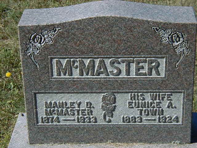 Manley Dufferin McMaster was born in 1874 at Brighton Twp., Northumberlnad Co., Ontario; Date 1874 per Memorial. Date 1874 & location Ont. per 1891 Census. Date 1871 & location Ont. per 1881 Census. per marriage reg'n. of daughter Theresa Helena (McMaster) Rittwage.1,3,4,5 He appeared on the census of April 1881 at Brighton Twp., Northumberlnad Co., Ontario; Age 10 at 1881 Census: see Samuel McMasters.3 He appeared on the census of April 1891 at Brighton Twp., Northumberland Co., Ontario; Age 17 at 1891 Census: see Samuel McMasters.4 He married Eunice Adelaide Town, daughter of Herbert Harvey Town and Calista Adelaide Dusenbury, circa 1900 at Ontario; per marriage reg'n. of daughter Theresa Helena (McMaster) Rittwage.1 Manley Dufferin McMaster lived on 17 December 1915 at Dunwich Twp., Dutton, Elgin Co., Ontario; WWI Atterstation Paper: Name: Manley Dufferin McMaster; Res.: Dutton, Ont; Born: Brighton Twp., May 10 1874; Kin: Eunice T. McMaster, wife, Dutton; Military Service: 3rd Dragoons, A. Co., Colborne, 9 yrs. (ancestry.com.)6 He died on 13 August 1933 at Murray Canal, Northumberland Co., Ontario; Death Reg'n.#025175: Name: Manley Dufferine McMaster; Date: Aug 13 1933; Age: 59y 3m 3d; Place: Murray Canal; Res.: Brighton; Status: widower; Occ.: Bridge Tender on Murray Canal; Parents: Samuel McMaster & Sarah Ann Hutchson, b. Ont; Inf.: Mrs. Altha J. Down, Brighton, sister; Cause: Accidental Drowning - "by upsetting his car into waters of Murray Canal" - may have had a heart attack; Phys.: Dr. F. M. Dure, Brighton; Burial: Mount Hope Cemetery, Aug 15 1933; Und.: B. E. Brintnell, Brighton; Reg'd.: Aug 16 1933; Reg'r.: Edward Nelson, Wooler (Ontario Death Registration, #025175-1933, ancestry.com) Date 1933 per Memorial.5,7 He was buried on 15 August 1933 at Mount Hope Cemetery, Brighton, Northumberland Co., Ontario; Memorial: (See Exhibit) McMASTER; Manley D; McMaster; 1874 - 1933; His Wife; Eunice A; Town; 1883 - 1924 (Mount Hope Cemetery, Brighton, Sep 26 2004) per Death Reg'n.5,8