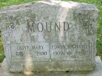 " the late ... " per marriage notice of son Wes Mound (Dec 29 1984).1 He was buried on 8 August 1980 at Mount Hope Cemetery, Brighton, Northumberland Co., Ontario; Memorial: (See Exhibit) MOUND; Olive Mary; 1911 - 2000; Edwin Richard; 1909 - 1980 (Mount Hope Cemetery, Brighton, June 30 2008) Per Death Notice.1,3