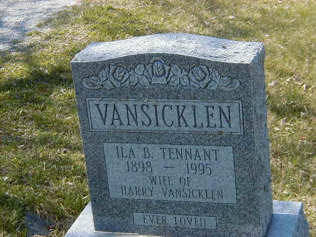 Ila B. Tennant was born in 1898 at Haldimand Twp., Northumberland Co., Ontario; Date 1898 & location Haldimand per marr. reg'n.1 She lived on 3 November 1920 at Percy Twp., Northumberland Co., Ontario; Residence Percy per marr. reg'n.1 As of 3 November 1920,her married name was Vansicklen.1 She married Harry Vansicklen, son of Ferdinand Vansicklen and Jane Smith, on 3 November 1920 at Percy Twp., Warkworth, Northumberland Co., Ontario; Marriage Reg'n.: #020800: Groom: Harry Vansicklen; Age: 29; Res. & Born: Cramahe Twp; Status: bachelor; Occ.: farmer; Rel.: Meth; Parents: Ferdinand Vansicklen & Jane Smith; Bride: Ila Tenit; Age: 22; Res.: Percy Twp; Born: Halidmand Twp; Status: spinster; Rel.: Meth; Parents: Hagreman Tennant & Isabella Hie; Wit.: Aarthur Nicholls, Percy Twp. & Irene Hie, Baltimore; Date: Nov 3 1920; Place: Warkworth; Performed by: J. R. Butler, Warkworth, Meth; Sworn: Colborne, Oct 27 1920; Reg'r.: H. J. Mayhew (Ontario Marriage Registration, #020800-1920, ancestry.com.)3 Ila B. Tennant was buried in 1995 at Warkworth Cemetery, Warkworth, Northumberland Co., Ontario; Memorial: (See Exhibit) VANSICKLEN; Ila B. Tennant; 1898 - 1995; Wife of; Harry Vansicklen (Warwkorth Cemetery, June 18, 2007.)2 She died in 1995; Date 1995 per Memorial.2