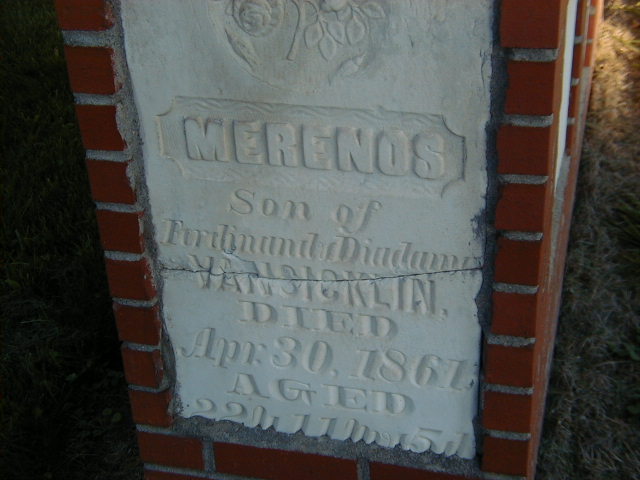 Merenos Vansicklen was born on 25 May 1838 at Murray Twp., Northumberland Co., Upper Canada; Date May 25 1838 per Memorial - age 22y 11m 5d at death Apr 30 1861. Date 1838 & location Northumberland Co. per 1861 Census. Date 1837 & location Cda. per 1851 Census.1,2,3 He appeared on the census of March 1851 at Brighton Twp., Northumberland Co., Canada West; Age 14 at 1851 Census: see Ferdinand Vansicklen.3 He appeared on the census of April 1861 at Brighton Twp., Northumberland Co., Canada West; Age 23 at 1861 Census: see James Vansicklen (brother.)1 He died on 30 April 1861 at Brighton Twp., Northumberland Co., Canada West, at age 22; Date Apr 30 1861 per Memorial.2 He was buried on 2 May 1861 at Vansicklen Cemetery, Brighton Twp., Boes Road, Northumberland Co., Canada West; Memorial: (See Exhibit) Merenos; Son of; Ferdinand & Diadama; Vansicklin; Died; Apr. 30, 1861; Aged; 22y 11m 5d (Vansicklen Cemetery, Boes Road, Brighton Twp., Sep 23, 2005.)2
