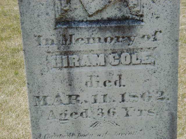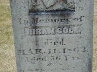 CemSearch: Name: Hiram Cole; Born: -- ; Died: Mar 11 1862; Age: 36; ID: SALEM0458; No other names; Cemetery: Salem Cemetery, Conc 1, Lot 21, Cramahe Twp., Village of Salem, Northumberland Co., Sec 1 Row 12 Plot 1; Note: Siblings Harriet Cole & Julia Ann