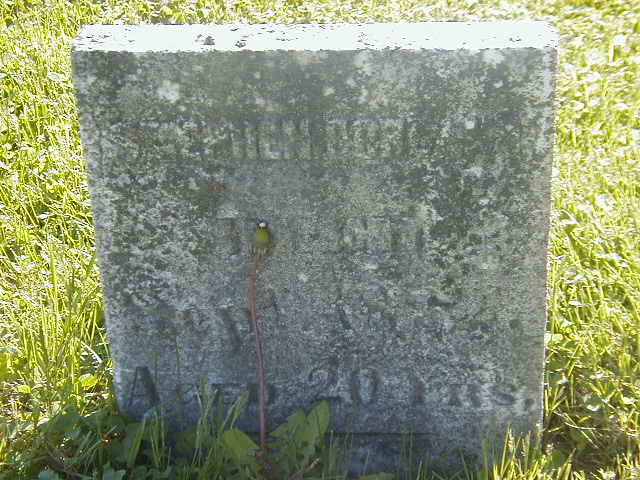 Stephen Palmer Dorland was born on 1 April 1812 at Hillier Twp., Prince Edward Co., Ontario; Date 1812 per Memorial - age 20 at death 1832. Date Apr 1 1812 & location Hillier per GEDCOM of Cheri Closson, Feb 29, 2008. Date 1812 per GEDCOM of Brian, Feb 21, 2008.1,2 He was buried in September 1832 at Wellington Cemetery, Wellington, Prince Edward Co., Ontario; Memorial: (See Exhibit) Stephen Dorland; Died; Sept. 1832?; Aged 20 Y'rs (Wellington Cemetery, Wellington, May 28 2006.)2 He died in September 1832 at Hillier Twp., Prince Edward Co., Ontario, at age 20; Date Sept. 1832 per Memorial. Date 1832 per GEDCOM of Cheri Closson, Feb 29, 2008. per GEDCOM of Brian, Feb 21, 2008.1,2