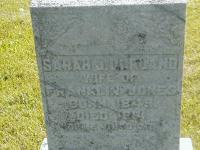 Note: This reg'n. is problematic. Parent of groom - Robert Jones??? No ages. No parents of bride. Witness W. D. Dorland would be brother of Sarah Jane Dorland.4 As of 7 November 1870,her married name was Jones.4 Sarah Jane Dorland appeared on the census of April 1881 at Hillier Twp., Prince Edward Co., Ontario; Age 30 at 1881 Census: see Franklin Jones.5 She died on 26 August 1881 at Hillier Twp., Prince Edward Co., Ontario, at age 32; Date 1881 per Memorial. Date Aug 26 1881 per GEDCOM of Doug Norman, March 4, 2008.2,3 She was buried on 28 August 1881 at Wellington Cemetery, Wellington, Prince Edward Co., Ontario; Memorial: (See Exhibit) Sarah J. Dorland; Wife of; Franklin Jones; Born: 1849; Died 1881 (Wellington Cemetery, Wellington, May 28 2006.)3