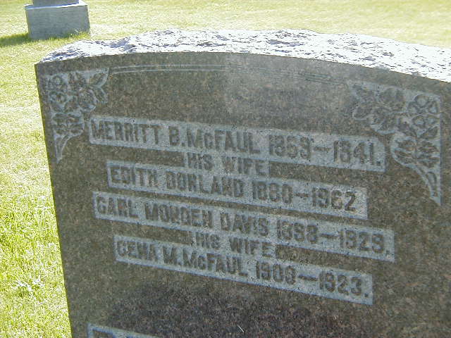 Merritt B. McFaul was born on 12 June 1869 at Hillier Twp., Prince Edward Co., Ontario; Date Jun 12 1869 & location Ont. rural per 1901 Census. Date 1869 & location Ont. per 1881 Census. Date 1871 & location Hillier per marr. reg'n. Date 1859 per Memorial.1,2,3,4 He appeared on the census of April 1881 at Hillier Twp., Prince Edward Co., Ontario; Age 12 at 1881 Census: see Haskel A. McFaul.4 He married Edith B. Dorland, daughter of William Davis Dorland and Emma L. Bedell, on 18 October 1899 at Hillier Twp., Prince Edward Co., Ontario; Marriage Reg'n.: Groom: Merritt McFaul; Age: 28; Res. & Born: Hillier; Status: bachelor; Occ.: farmer; Parents: Haske A. & Louisa Jackson... Date: 1899; Place Hillier Twp... (Ontario Marriage Registration, ancestry.com.)1 Merritt B. McFaul appeared on the census of April 1901 at Hillier Twp., Prince Edward Co., Ontario; Age 31 at 1901 Census: see Harold A. McFaul.3 He died in 1941 at Ontario; Date 1941 per Memorial.2 He was buried in 1941 at Wellington Cemetery, Wellington, Prince Edward Co., Ontario; Memorial: (See Exhibit) Merritt B. McFaul 1869 - 1941; His Wife; Edith Dorland 1880 - 1962; Carl Morden Davis 1898 - 1929; His Wife; Gena M. McFaul 1900 - 1923 (Wellington Cemetery, Wellington, May 28 2006.)2