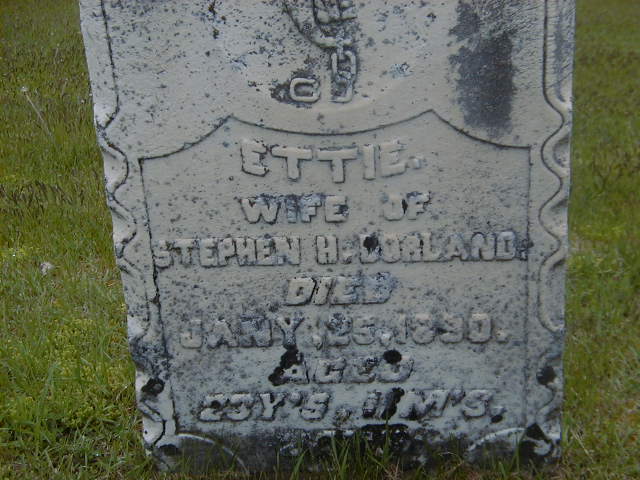 Etta C. "Ettie" ? was born on 7 February 1866 at Murray Twp., Northumberland Co., Ontario; Date Fev 7 1866 per Memorial - age 23y 11m 18?d at death Jan 25 1890. Date 1866 & location Murray per Death Reg'n.1,2 As of circa 1885,her married name was Dorland.1 She married Steven Henry Dorland, son of Samuel Casey Dorland and Calista Helen Lott, circa 1885 at Ontario; per Death Reg'n. of Ella C. Dorland.1 Etta C. "Ettie" ? died on 25 January 1890 at Murray Twp., Northumberland Co., Ontario, at age 23; Death Reg'n.#011923: Name: Ella C. Dorland; Date: Jan 25 1890; Age: 24 yrs; Status: wife of farmer; Born: Murray Twp; Cause: consumption, 3 mo; Phys.: Day & McKaque; Inf.: R. C. Macauley, Murray; Reg'd.: Jan 27 1890; Rel.: Meth; Reg'r.: T. R. Garratt (Ontario Death Registration, #011923-1890, ancestry.com.)3 She was buried on 27 January 1890 at Stockdale Cemetery, Murray Twp., Stockdale, Northumberland Co., Ontario; Memorial: (See Exhibit) Ettie; Wife of; Stephen H. Dorland; Died: Jany 25, 1890; Aged: 23 Y's, 11 M's; & 26 D's (Stockdale Cemetery, Stockdale, May 26 2006.)2