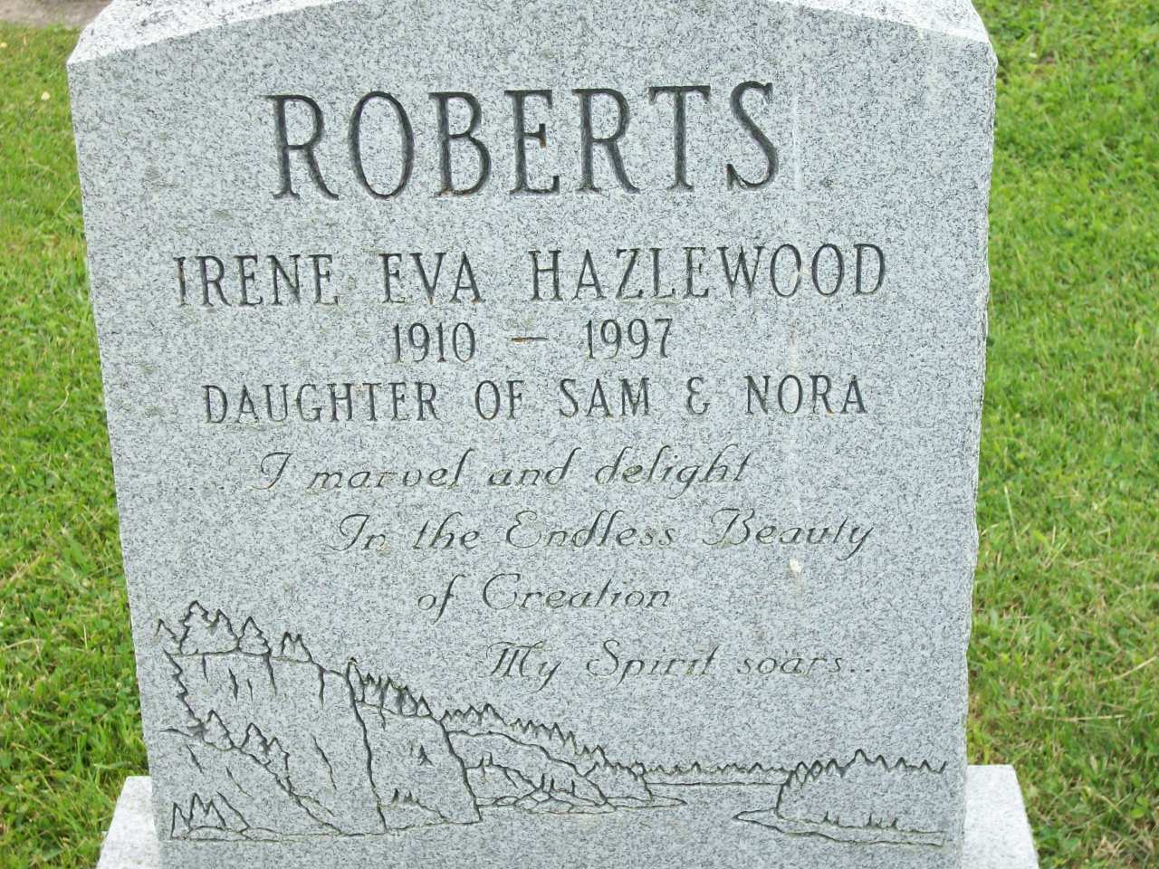 Eva Irene Hazelwood was born on 20 February 1910 at Conc 7 Lot 3, Brighton Twp., Orland, Northumberland Co., Ontario; Birth Reg'n.#034237: Name: Eva Irene Hazlewood; Date: Feb 20 1910; Place: Conc 7, Lot 3, Brighotn Twp; Parents: Samuel Hazlewood, Blacksmith & Nora May Cole; Married: 1901, Brighton Twp; Phys.: Dr. Sanford; Inf.: S. Hazlewood, father, Orland; Reg'r.: Fred O. Wade, Brighton Twp. (Ontario Birth Registration, #034237-1910, ancestry.com) Date 1910 & location Ont. per 1921 Census. Date 1910 & location Ont. per 1911 Census. Date 1910 & daughter of Sam Hazelwood & Nora Cole per "The Cole Family", compiled by Lulu Heales, July 1985, copied from The Tweedsmuir Histories of Codrington at The Metro Toronto Reference Library, Nov 2007.1,4,5,6 She appeared on the census of 1911 at Brighton Twp., Orland, Northumberland Co., Ontario; Age 1 at 1911 Census: see Samuel Hazelwood.5 She appeared on the census of 13 June 1921 at Brighton Twp., Orland, Northumberland Co., Ontario; Age 11 at 1921 Census: see Samuel Hazelwood.4 As of circa 1928,her married name was Roberts.1 She lived on 29 August 1964 at Stirling, Hastings Co., Ontario; Survived by - per Death Notice of her mother, Nora Mae (Cole) Hazelwood - from The Tweedsmuir Histories of Codrington copied from microfilm at The Metro Toronto Reference Library, Nov 2007.1 She lived on 8 April 1986 at Codrington, Northumberland Co., Ontario; "He is the brother of Mrs. Lillie Wright, Belleville; Mrs. Irene Roberts, Codrington; Mrs. Lulu Heales, RR 1, Campbellford; Norman Hazelwood of Trenton and Bryce Hazelwood of RR 2, Codrington." per Death Notice of Robert Hazelwood, from The Tweedsmuir Histories of Codrington, copied from microfilm at The Metro Toronto Reference Library, Nov. 2007.1 She died on 16 March 1997 at Peterborough Hospital, Peterborough, Ontario, at age 87; Date 1997 per Memorial. Date Mar 16 1997 & location Peterborough Hospital per family tree of lornacole on ancestry.ca, Apr 19 2021.2,7 She was buried on 19 March 1997 at McPhail's Cemetery, Brighton Twp., Northumberland Co., Ontario; Memorial: (See Exhibit) ROBERTS; Irene Eva Hazelwood; 1910 - 1997; Daughter of Sam & Nora (McPhail's Cemetery, Brighton Twp., June 30, 2008.)2