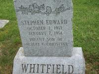 CemSearch: Name: Stephen Edward Whitfield; Born: Oct 7 1953; Died: Jan 7 1954; ID: MCPGLS64; No other names; Cemetery: McPhail's Cemetery, Conc 5, Lot 30, Brighton Twp., Old Wooler Road south of Codrington; Note: Infant son of Albert and Christine Whitfield. Info from 7th Town Historical Society (https://www.cemsearch.ca/burial/?pid=MCPHLS64%5E0.)2,3