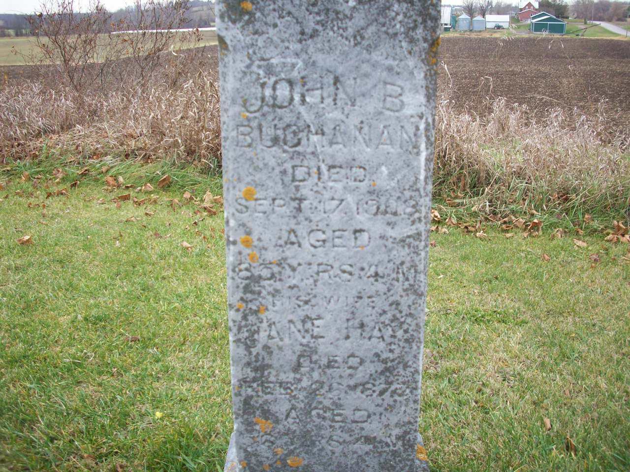 CemSearch: Name: John B. Buchanan; Born: May 1823; Died: Sep 17 1908; Age: 85; ID: BURNBR180; Other names: Buchanan, Jane [Hay](1820-1877), Buchanan, John ( - 1860); Cemetery: Burnbrae Cemetery, Seymour Twp., Conc 5 Lot 22, Plot 180 (https://www.cemsearch.ca/burial/?pid=BURNBR180%5E0.)2,9